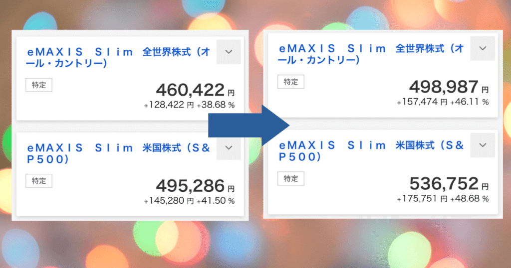 「オルカン(eMAXIS Slim 全世界株式)」と「S&P500(eMAXIS Slim 米国株式)」の投資結果を振り返ってみましょう。